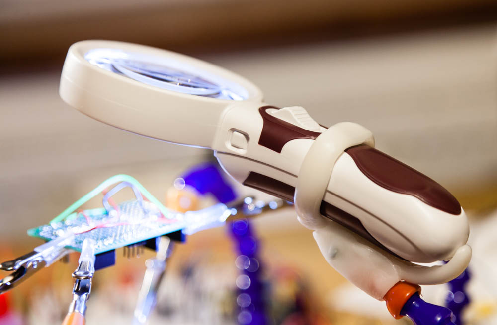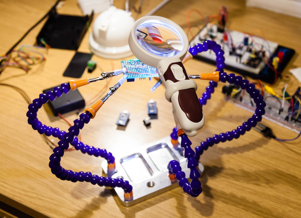 I found this cool Third Hand from Hobby Creek, which is doing a great job to fasten objects for soldering. It only lacks a magnifier.